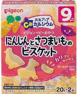 PIGEON 嬰兒高鈣動物餅 (紅薯+胡蘿蔔) [平行進口] ●日本製 ●適合: 9個月或以上 每盒24g(2枚×6袋) 成分:小麥粉(日本國內生產),糖,起酥油,蔬菜粉(紅薯,胡蘿蔔),玉米澱粉,低聚果糖,鹽/膨脹劑,碳酸鈣,卵磷脂