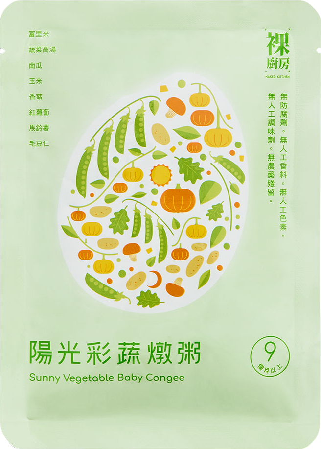 和營養師共同開發的裸廚房常溫大寶寶粥, 食材跟米3:1的食材比例讓寶寶的營養更豐富, 嚴格使用優質食材及花東富里有機米, 每包160克容量更升級, 而且每個口味都用成品通過196項SGS檢驗, 讓寶寶吃得開心, 媽媽更放心!