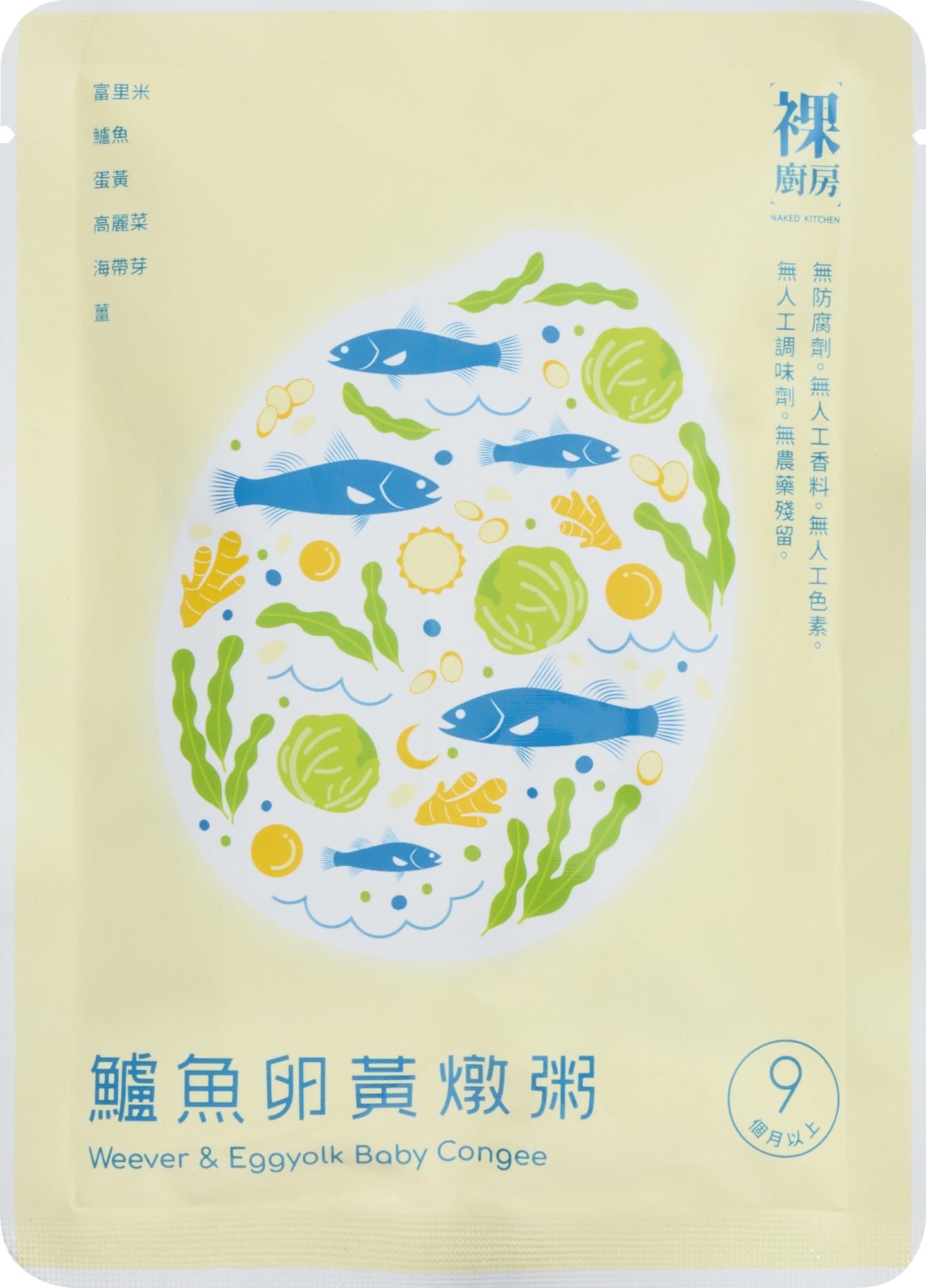 成分 : 水,鱸魚,白米,蛋黃,高麗菜,橄欖油,海帶芽,薑