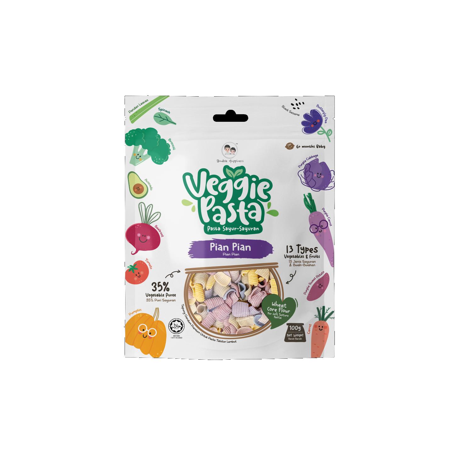優質小麥粉、水、蔬菜泥(番茄、菠菜、南瓜、澳大利亞胡蘿蔔、甜菜根、紫甘藍、日本紫薯、黑芝麻、紫胡蘿蔔、蝶豆花、西蘭花、牛油果和香蘭葉)