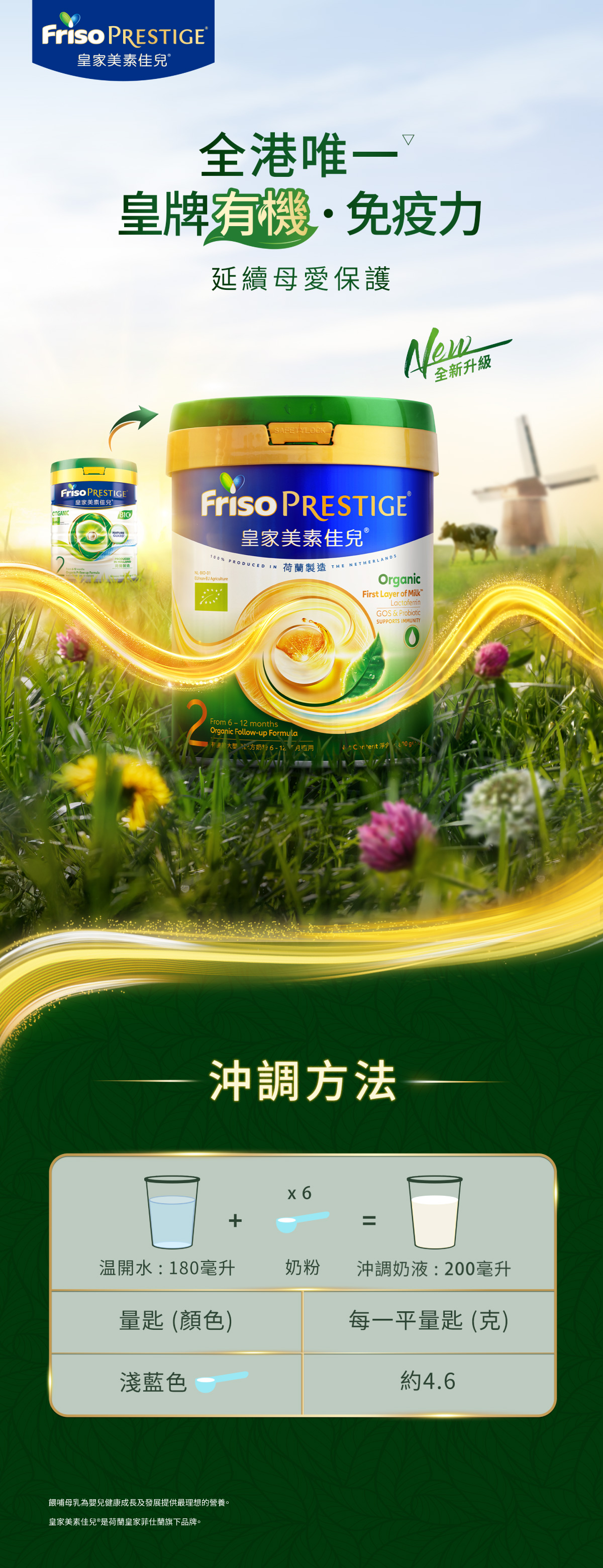 有機荷蘭皇家美素佳兒®全港唯一源自荷蘭有機自家農場,為乳牛提供天然、豐富營養,助乳牛生產營養豐萃的有機牛奶。產品製作過程堅守有機標準,配方蘊含有機第一層乳脂精華,加上豐富DHA、有機益生纖維GOS支持腸道健康,支持寶寶全方位健康發展。